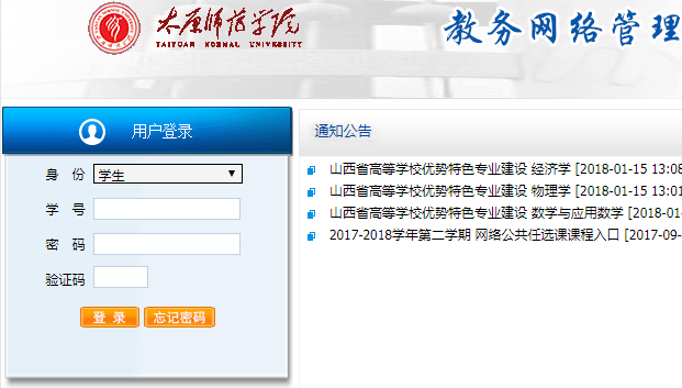 2017-2018學(xué)年第二學(xué)期 網(wǎng)絡(luò)公共任選課課程入口 [2017-09-18 12:22:18] 太原師范學(xué)院教務(wù)網(wǎng)絡(luò)管理系統(tǒng)登錄