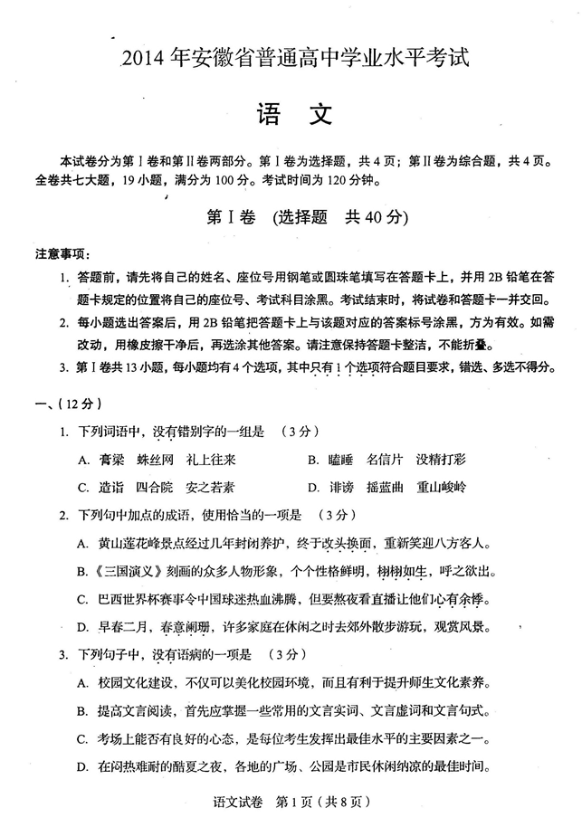 安徽省2014年普通高中學(xué)業(yè)水平考試語文試題及答案