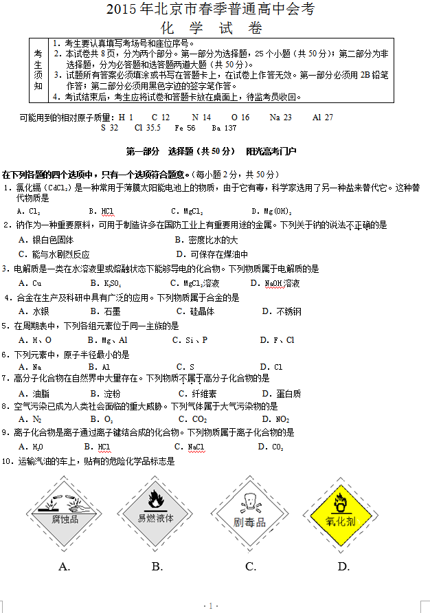 北京市普通高中2015年春季會考化學(xué)試題及答案