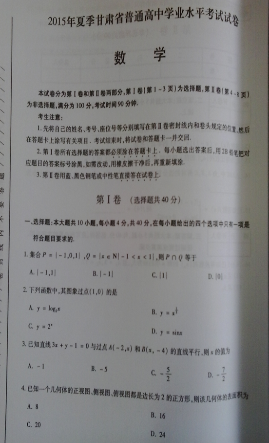 甘肅省2015年夏季高中學(xué)業(yè)水平考試數(shù)學(xué)試題卷