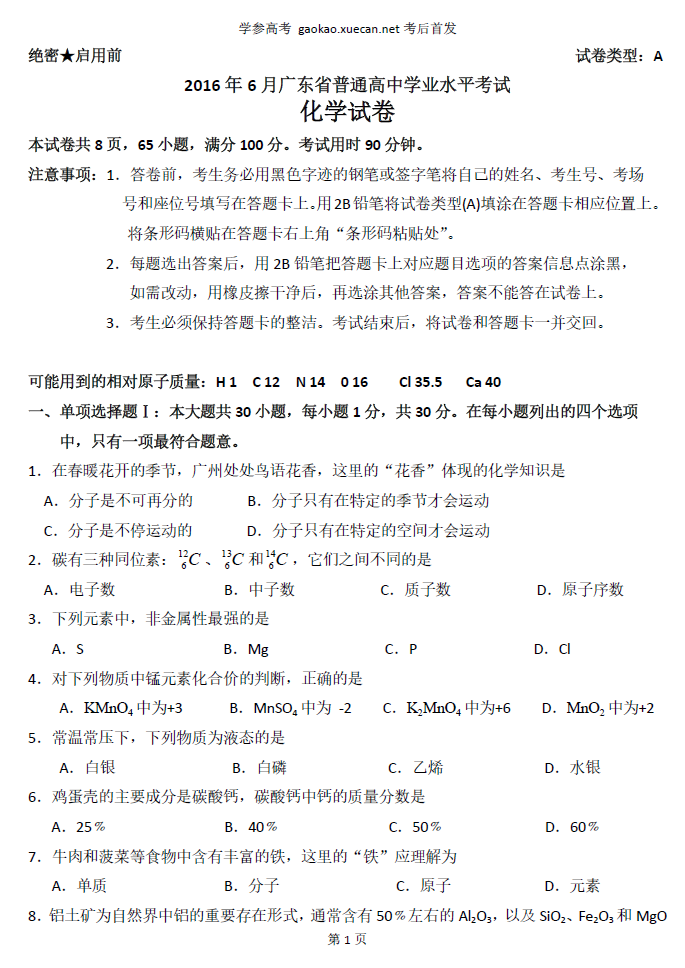 2016年6月廣東省普通高中學(xué)業(yè)水平考試化學(xué)試卷真題及答案(下載)