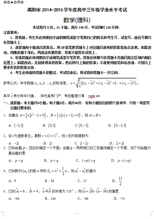 廣東揭陽(yáng)2014-2015學(xué)年度高中三年級(jí)學(xué)業(yè)水平考試?yán)砜茢?shù)學(xué)試題