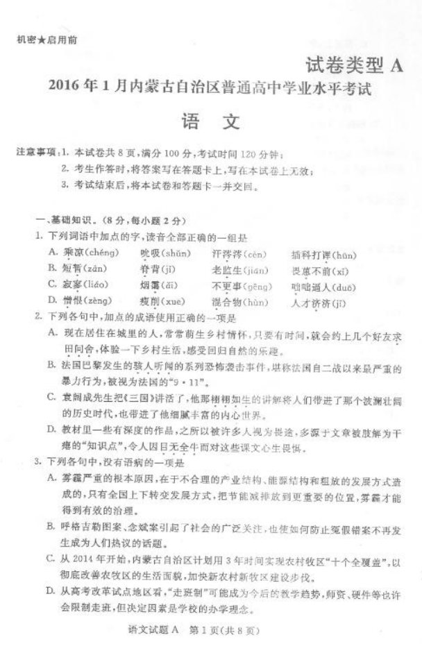 內蒙古2016年1月普通高中學業(yè)水平考試語文試題及答案