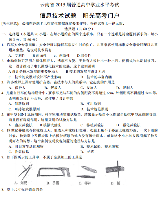 云南省2015年1月普通高中學(xué)業(yè)水平考試信息技術(shù)試題及答案