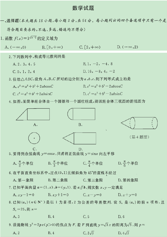 浙江省2015年10月高中學業(yè)水平考試高考選考科目數(shù)學試題及答案
